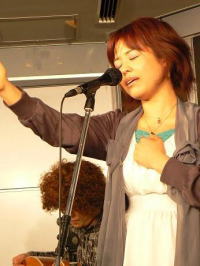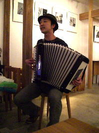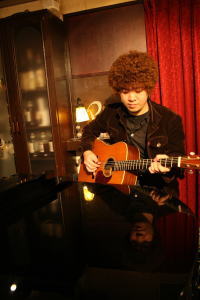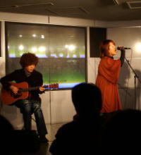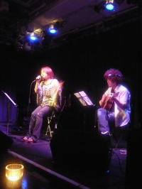 お待たせしました〜♪ 藤本記子、自主企画!? バースデーイブライブレポートです。 今回お世話になった会場は赤坂Drunk Bears。 外国人のお客様も多く、国際的な雰囲気が漂いながらも とってもアットホームで気軽に楽しめるパブです。 金曜の夜とあって、会場はとってもに賑わっていました。 いとを君、かっこいい〜ねぇ♪ ひゅーひゅー。 ふくとみはいっつも猪木顔。他にないのかw この夜もいつものトリオでお届けしましたが 私の大好きなシンガーソングライター荏原健太くんに 第二部で特別出演していただくことになっていたので この日をずっと首を長くして待っていました。 まずは第一部スタート!! <曲目> 1. 月下美人 2. 蝶々 3. Take Me Home,Country Roads 4. プロローグ 5. すき 6. Anyone at all 洋楽カバーはとっても好評なのですが 特に「Take Me Home,Country Roads」は曲中で拍手喝采でした★ すごく嬉しい会場の反応・・・。 この曲、少しずつ私の体になじみつつあります。 とってもぴったりと。 そしてそして、待ちに待った第二部は荏原健太君の登場!! まずはカバー曲。憧れのFaith Hil